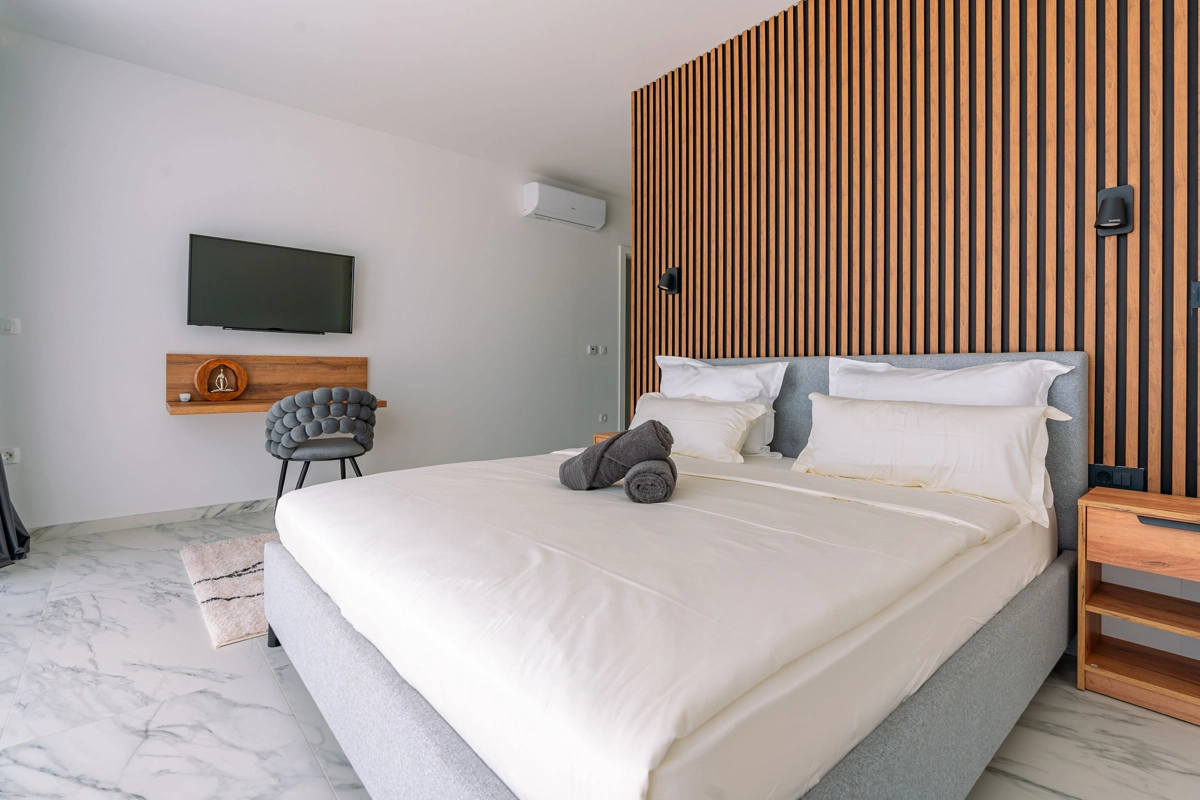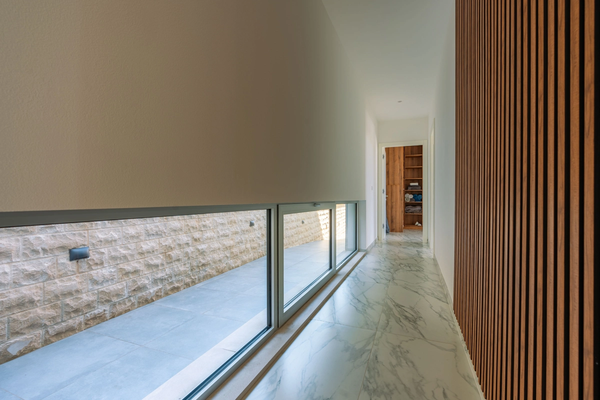 Suvremena arhitektura, minimalistički dizajn interijera i eksterijera. Iz vile se pruža prekrasan pogled na grad Korčulu, Badiju i zelenilo.